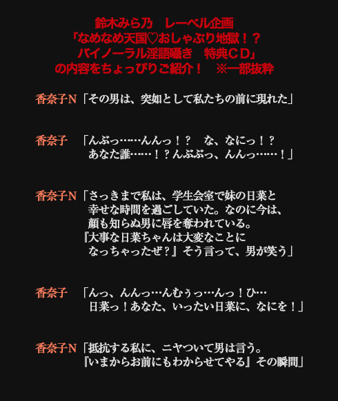 | DVD特典 | なめなめ天国♡おしゃぶり地獄!? バイノーラル淫語囁きCD付 |
